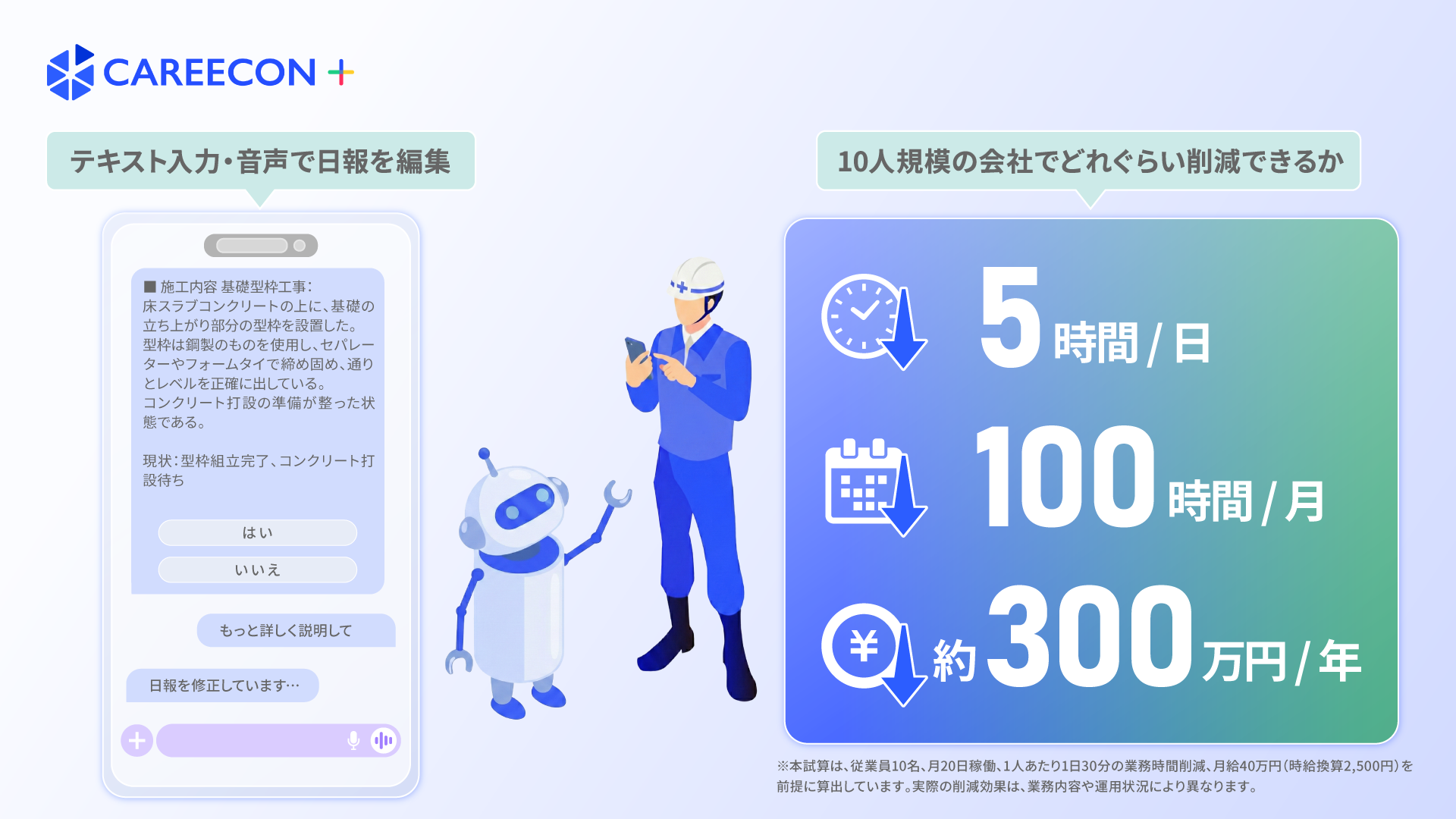 これにより、これまで日報作成にかかっていた入力や整理の手間が軽減され、1人あたり1日約30分の業務時間削減が期待されます。従業員10名規模の会社では、月20営業日換算で約100時間、時給2,500円とした場合月25万円、年間で約300万円相当の人件費削減効果が見込まれます。